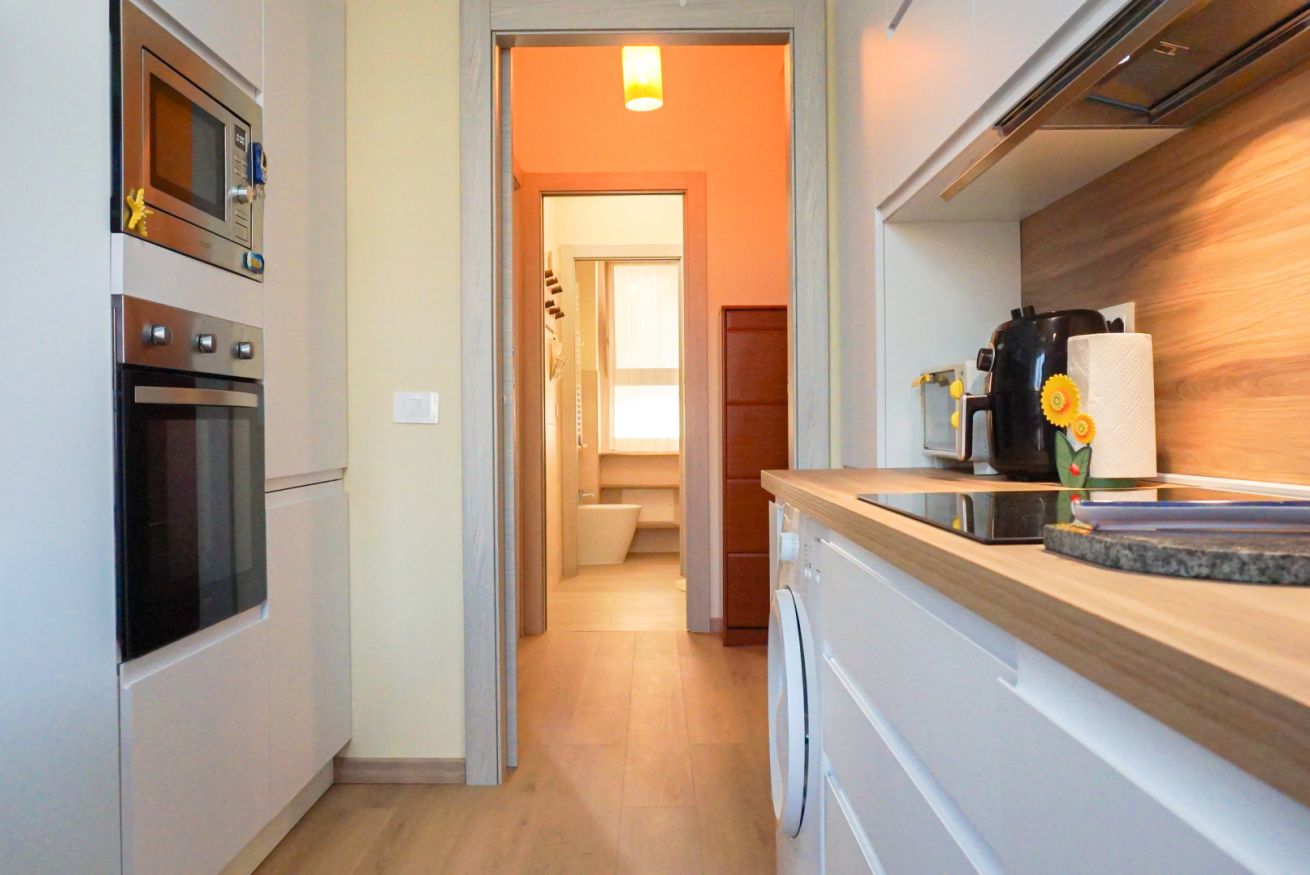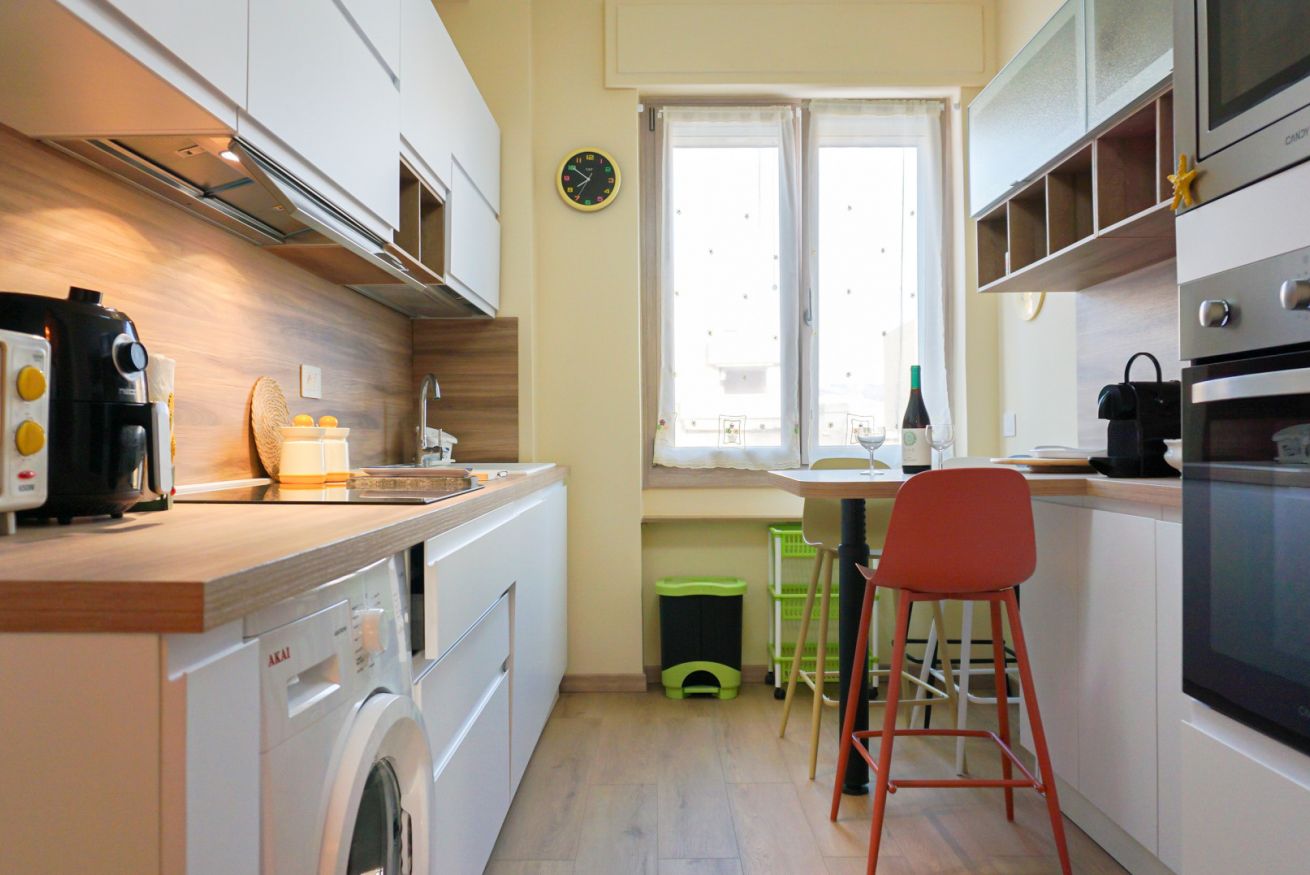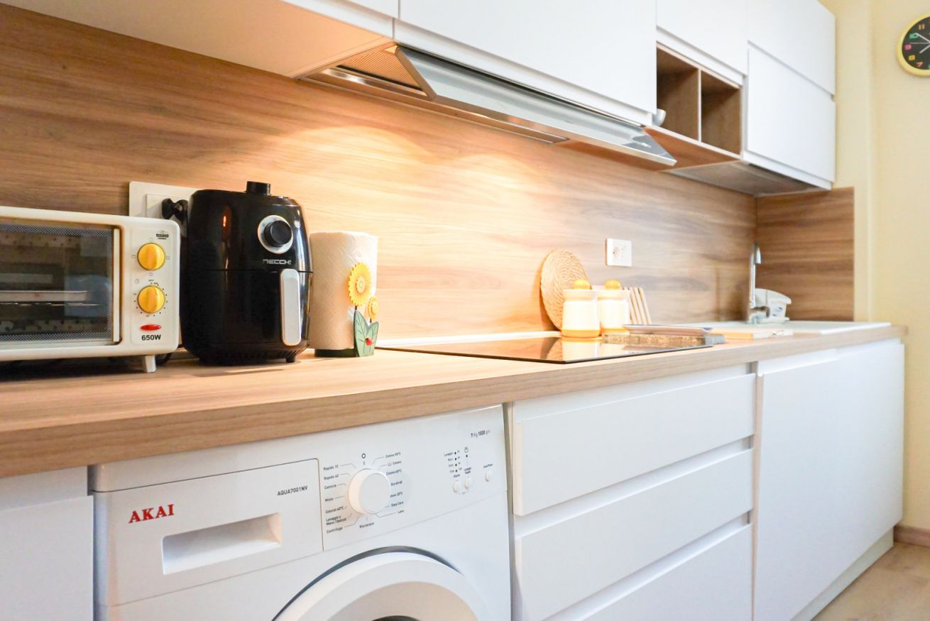 Cucina completamente accessoriata: piano cottura, forno, frigorifero, freezer, stoviglie, pentole, macchina del caffè, lavatrice e molto altro