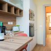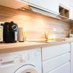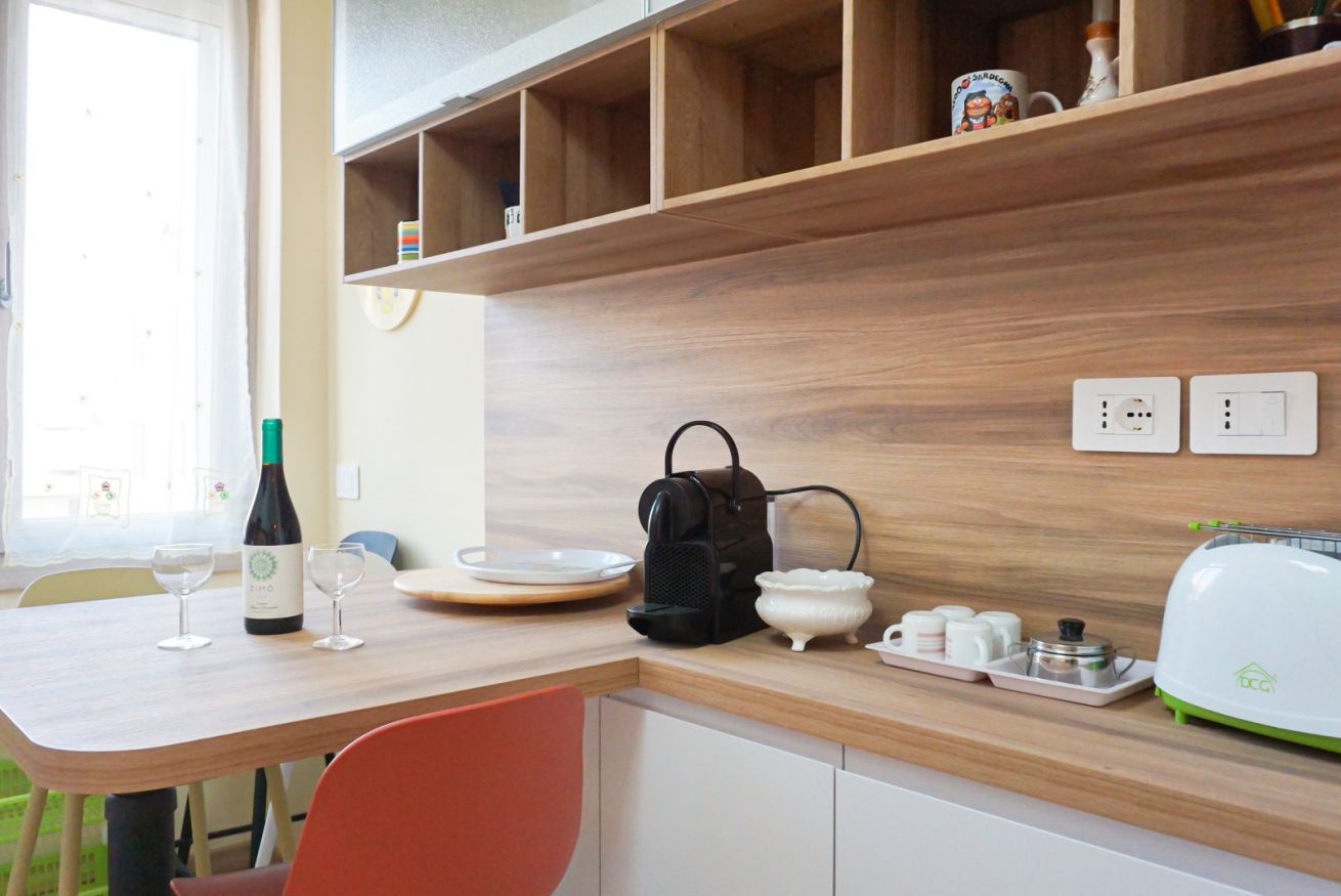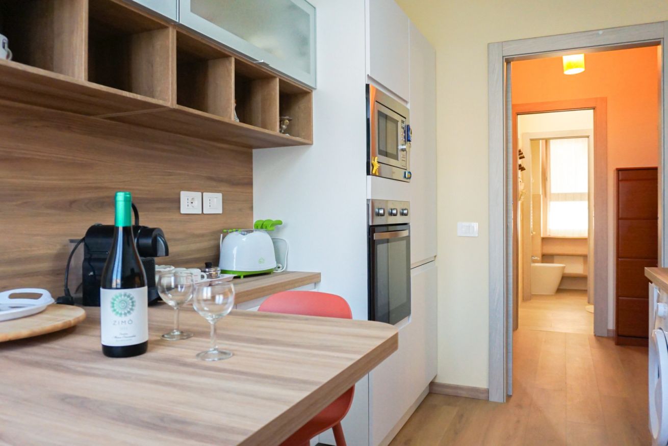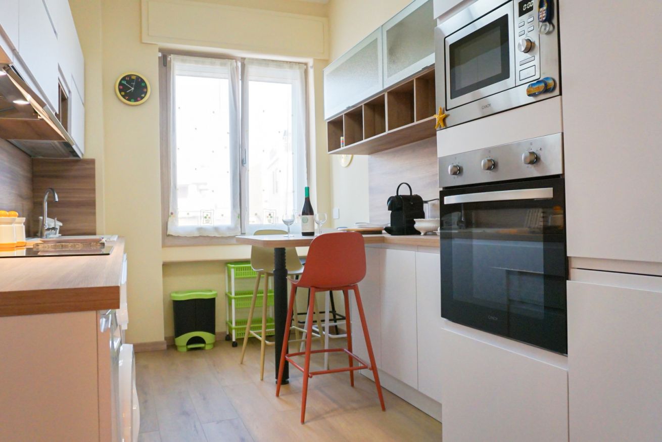 Cucina completamente accessoriata: piano cottura, forno, frigorifero, freezer, stoviglie, pentole, macchina del caffè, lavatrice e molto altro
