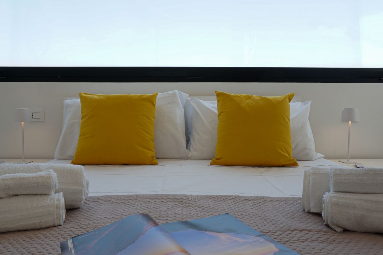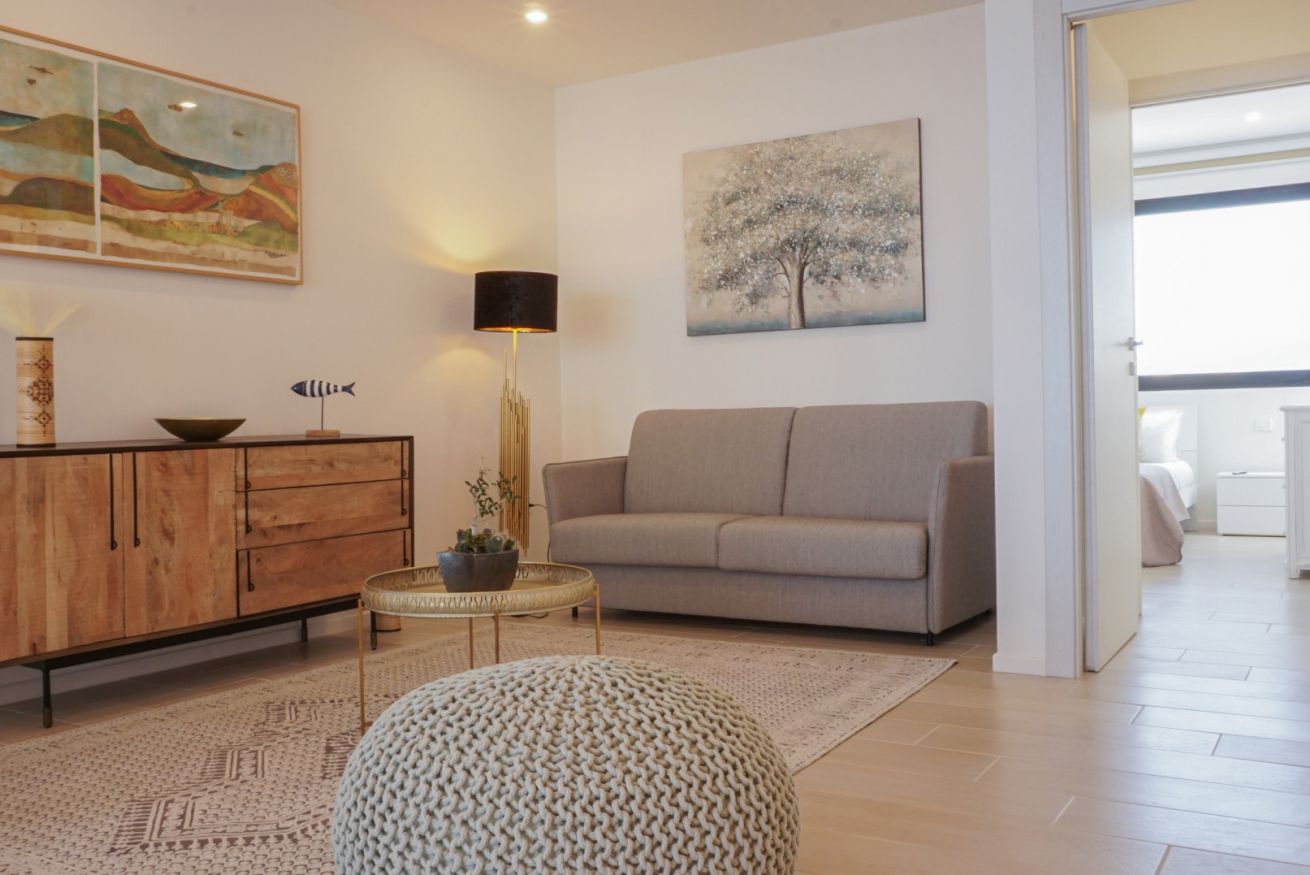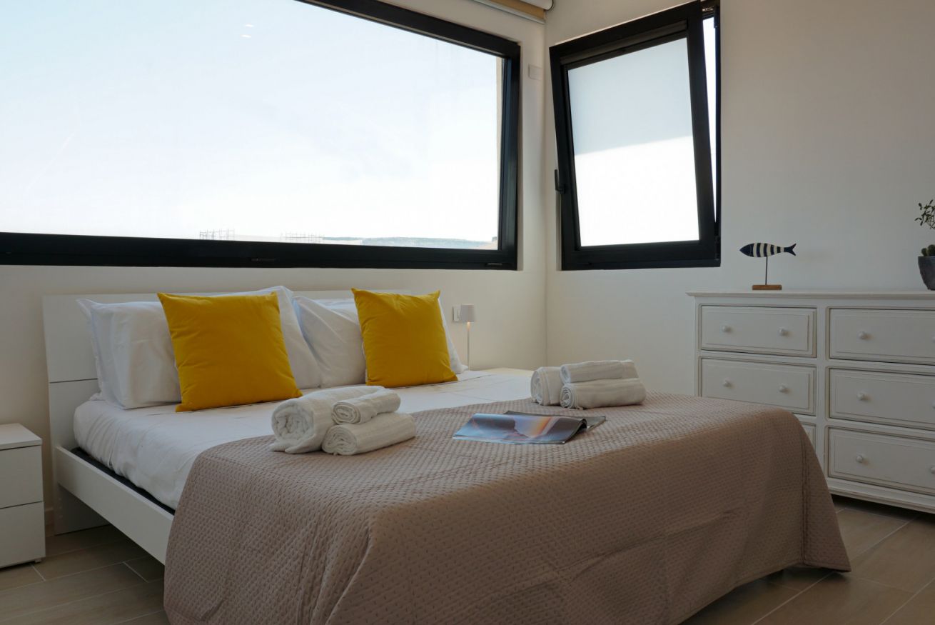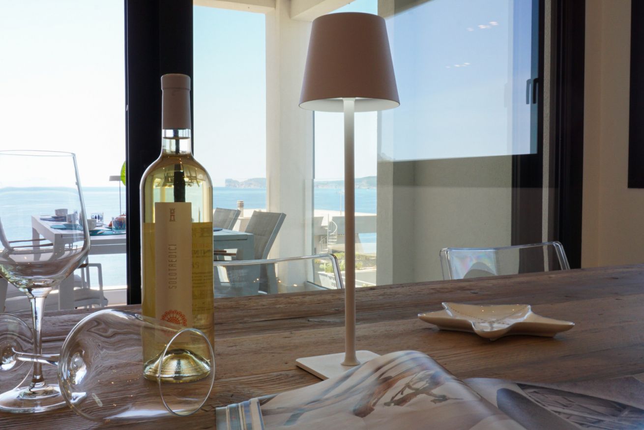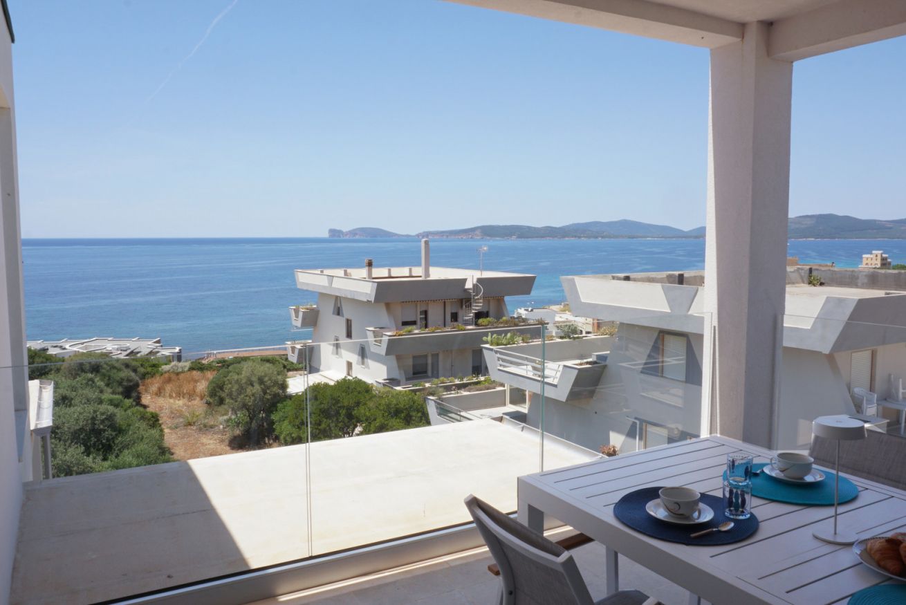 Al suo ingresso, veniamo accolti da un open space con cucina ed ampia sala, illuminate da una grandissima porta finestra con vista su Capo Caccia. Dalla zona giorno accediamo alla zona notte, dove troviamo un bagno completo con ampia doccia ed una camera matrimoniale caratterizzata dalle grandi vetrate.