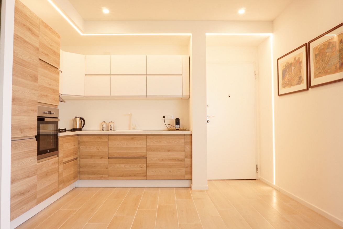 La particolarità dell'appartamento è data dalle grandi vetrate a tutta altezza ed un gioco di luci che conferisce maggiore luminosità alla casa.